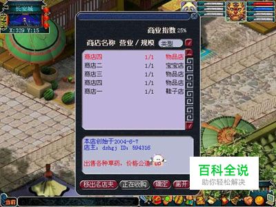 商店管理 成功开设商店后,玩家即成为店主,可以进行投入资金、取出资金、变更类型和宗旨等日常的管理。 店主可以随时决定商店开门营业或暂停营业。在商店开设期间,需要支付日常的维护费用和经营费用,其中经营费用只在商店营业状态下才会计算。 店主可以花费2万两银子变更商店的类型。 店主可以花费10万两银子变更商店的名称,变更后创店日期变为当前日期。