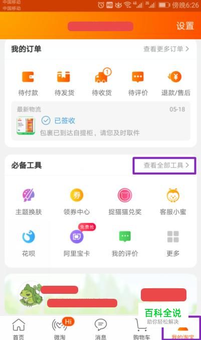 进入手机淘宝之后,我们点击右下角的我的淘宝,然后点击查看全部工具;