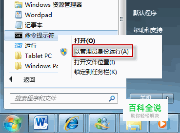 在“开始->所有程序”中找到“附件”。右键单击“命令提示符”,选择“以管理员身份运行”若弹出用户账户控制窗口,请允许以继续
