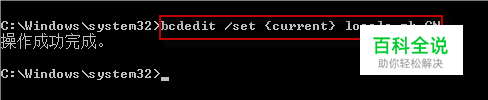 如果不一致,请在命令窗口中键入"bcdedit /set {current} locale XX-XX"(不包含双引号)命令进行修改。命令输入完毕后,按一下键盘上的回车键。