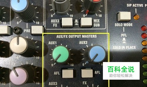 再下来就是让人头痛的AUX旋钮,好多人不解这东东是干嘛用的,怎么有时候拧了也没有反应这么坑爹。来来来~又到了体育老师秀英文的时候了:大家一齐跟我读一次-----"屙屎”!(用粤语哦!)AUX,AUX输出,AUX通道,辅助输出,辅助输出母线:作用是把该通道的信号按需要发送到一个辅助输出母线通道上,一般用作舞台返送信号源,效果器信号源,超低音箱音源,补声信箱信号源,耳机返送音源等等。(下面简称AUX和AUX输出) 在继续侃晕你们之前,先说说刚刚上面说到的“母线”这东东母线通道是录音混音的一个概念来的,在调音台上我们可以这样理解:只要能够收集到其他通道信号的输出通道,都可以称为母线。后面也会讲到一级,二级,三级母线。(这些是我自己想出来的)分别对应是,一级母线: AUX输出, GRUOP输出,Mix Bus输出(这个数字台才有),二级母线:左 中 右声道主输出。三级母线:矩阵输出。再说一次,只要能够收集到其他通道信号的输出通道,都可以称为母线,AUX是一个可以输出的母线来的。 好了上面脑补了“母线”的概念后我们继续扯蛋。还是看我们的标记A,这是该通道的几个AUX旋钮,分别是AUX1、AUX2、AUX3三个各自独立的AUX通道,旋钮是用来控制该通道发送到AUX输出的量,你拧得越多发送到该AUX输出的信号电平就越大,一般称为AUX发送量。再看下图这里分别是三个AUX输出的总开关,因为成本问题所以做成旋钮式,其实这个旋钮的开关相当于我们平时用到的推子,只是变成了旋钮的形式而已。