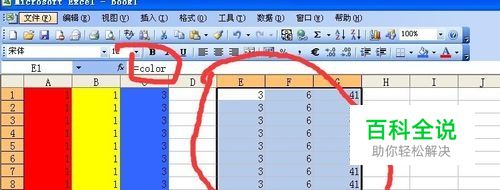 选择一块与根据颜色求和同样长宽的区,并将活动单元格定位到最最上角,并在单元格中输入”=color“,然后按ctrl+回车,(ctrl+回车的过程是将名称对应的函数复制到框选区域的过程,函数内的参数是相对引用的)大红圈中的返回值3,6,41分别代表红黄蓝三种颜色的代码