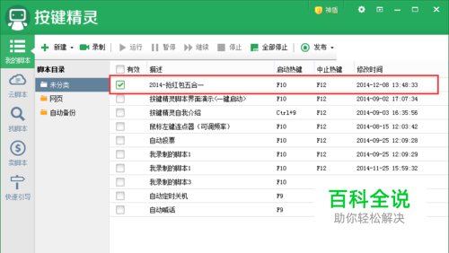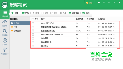 使用脚本例子 打开按键精灵的时候就可以在主界面中看到自带的脚本例子。使用这些例子非常简单,只要选中一个或是多个脚本有效,然后再按下相应的启动/中止热键就可以启动/中止脚本了。 具体操作步骤如下:
