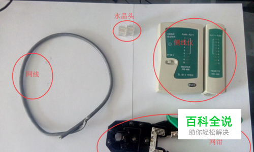 首先我们介绍下工具,网线平常都可以见到,网线其实分好多种有五类,超五类,六类,超六类等,建议家用 五类以上网线。水晶头无论是五金店还是电脑店都可以买到,买六类以上网线的最好使用专用水晶头。网钳,超五类一下网线可以随便去五金店买那种便宜的网钳,但是六类以上最好买那种价格稍贵但是材质比较好的网钳那样使用的时间会更长一些。侧线仪,需要经常做网线的读者可以买一个用来测试网线是否畅通,做不好的网线是不能用来传输数据的。所有工具如图所示。