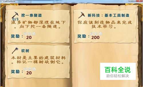 我们先来看看任务吧,一般任务里都是包含着教程的。 这有3个任务,“挖一条隧道”“砍一棵树”“制造工具”