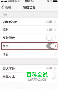 2.在辅助功能菜单上点击选择”灰度”选项。这时候iPhone画面变成了黑白模式,开启“灰度”选项之后,每分钟的耗电量百分比要相对减少,省电效果会比较明显。