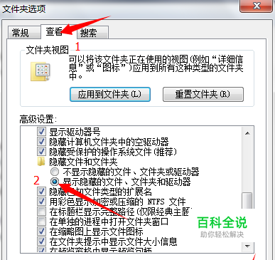 其打开的窗口如下图,在查看选项中找到“显示隐藏的文件,文件夹和驱动器”, 选中它,再单击应用和确定即可,这是所有的隐藏文件会被显示出来。