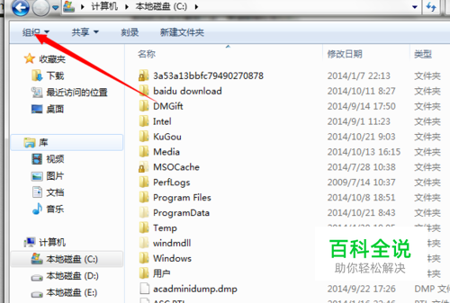 打开C盘,在左上角有个选项“组织”,点击它右边的小三角符号,如图, 在下拉菜单中有有个文件夹和搜索选项,点击它。