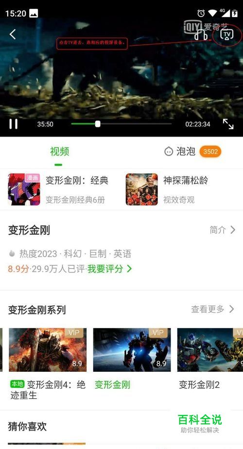其次,打开手机连接上移动的宽带网络。在手机上的APP找到要看的电视剧或者电影等等。我这里已爱奇艺为例子,打开爱奇艺,找到我要看的电影,后点击打开。这个时候可以看到手机屏幕上有一个TV的图标,点击进去,你会发现有好多可以投屏的设备。我这里选的是魔百和。