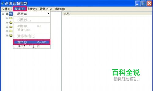 3,这就进入了注册表,进入之后,点菜单上的“编辑”,在打开的下拉菜单中选择“查找”。