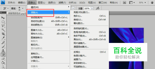 选择图像菜单下面的调整,然后在二级菜单下面选择去色选项,如下图所示