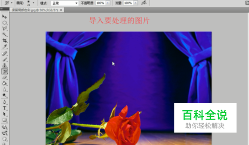 打开PhotoShop软件,导入我们要处理的图片,我们需要把整个图片变为黑白的,然后花的颜色保留,如下图所示
