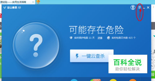 启动金山毒霸10,点击选择程序界面右上角的【菜单】按钮。(如图所示)