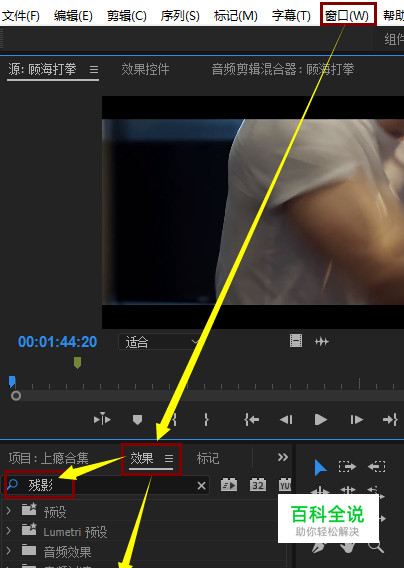 方法一: 2、找到“效果-视频效果-时间-残影”(或直接在“效果”搜索栏输入“残影”,进行搜索),将“残影”图标拖至所需视频上 注:若没有找到“效果”,可点击“窗口”,勾选效果后再进行操作