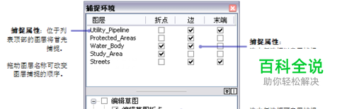 使用“捕捉环境”窗口可以指定希望新要素捕捉到要素的哪个部分(折点、边或端点)。通过选中下图所示窗口中的对应复选框,可以启用要使用的捕捉属性类型。