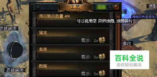 然后我们点击黄金制图仪,将一个异界地图放进去,选择第一项工艺:增加物品数量百分之四(不需要消耗任何东西),点击启动就可以开启增加了物品数量的异界地图了。