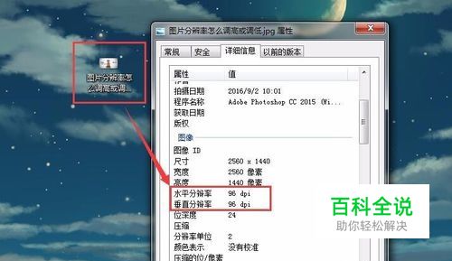 首先,我准备了一张我自己常用的图片,右键查看图片的属性可以知道图片的水平和垂直分辨率都是96dpi(dpi代表分辨率的数值和我们的电脑屏幕分辨率一样),宽度2560像素,高度1440像素。