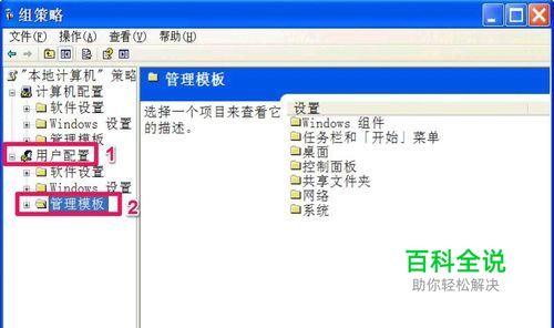 2,进入组策略后,先在左侧目录中找到“用户配置”这一项,然打开它的子项,找到其中的“管理模板”。