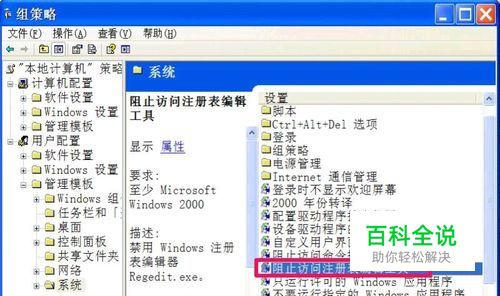 4,然后到"系统"这一项的右侧窗口,在右侧的设置选项框中,找到“阻止访问注册表编辑工具”这一项,双击。