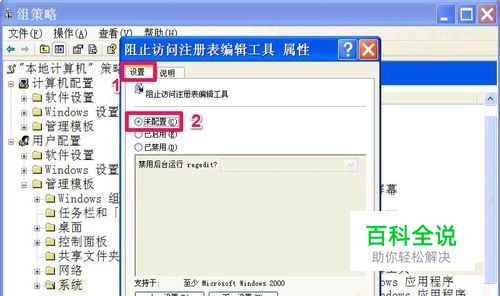 5,打开了“阻止访问注册表编辑工具”属性窗口后,在“设置”项下,选择“未配置”这一项,然后先按“应用”,再按“确定”。组策略中的“阻止访问注册表”成功解除。