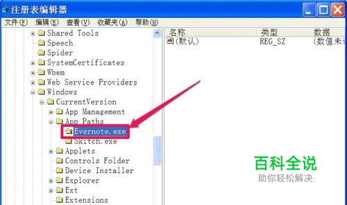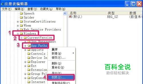 3,然后按HKEY_CURRENT_USER\Software\Microsoft\Windows\CurrentVersion\App Paths这个路径定位于App Paths这项上,右键,从菜单中选择“权限”。