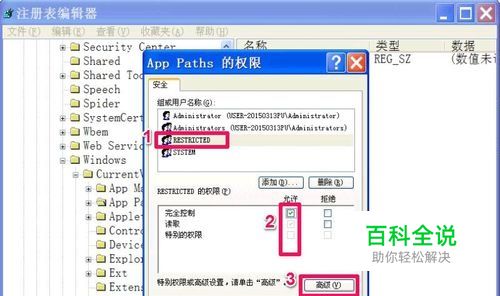 5,如果用户名称已经存在,则选择自已用户名,这里以“RESTRICTED”为例,然后在下面的权限列表框中,勾选“允许”下的“完全控制”复选框,然后按“应用”与“确定”退出注册表。
