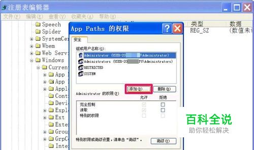 4,进入“App Paths权限”窗口后,如果在“组或用户名称”中没有当前用户时,那就要“添加”一个。