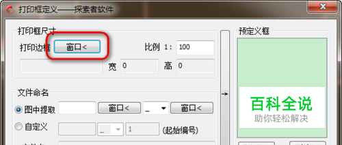 定义打印框尺寸,且设置文件命名规则,并加入预定义框。 1) 定义打印框尺寸,在打印框尺寸栏里选择【窗口】,对图纸边框进行框选,程序根据打印框的大小,自动判断纸张的大小类型。根据单选按钮【图中提取】【自定义】来以T或Z开头命名。