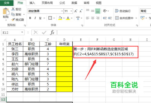 第一步:用IF判断函数选定查找区域,以C2单元格为例,输入公式“=IF(C2<4,$A$15:$B$17,$C$15:$D$17) ”