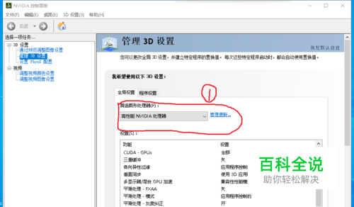打开NVIDIA,看到全局设置,显示“高性能NVIDIA处理器”的就得改。看红圈圈。