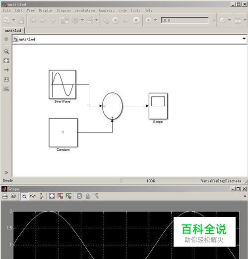 第八,然后点击File->Save保存该模型(untitled.slx),再点击Simulation->Run运行该模型。保存和运行应该都没有问题,最后点击Scope,并点击Scope工具栏中的Autoscale,得到如下正弦函数sin(x)+1的图形。