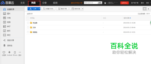 打开百度云之后进入的界面为“主页”界面,点击上面的“网盘”按钮,到网盘界面,这里可以看到小编历史上传的文件夹,如图二