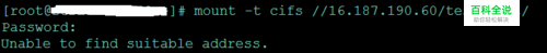 mount -t cifc "windows共享文件夹" "Linux /mnt路径" i.e. mount -t cifs //16.187.190.60/test /mnt/ Linux 会要求输入访问Windows 共享文件夹上的密码。 注意: Linux中提示: Unable to find suitable address. 说明远程共享文件夹路径不存在。请仔细检查,并更正目录路径。
