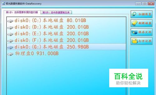 打开极光数据恢复软件后,会自动显示所有的分区包括损坏的G盘和物理盘。我们只需要双击要恢复的G盘就可以对G盘开始恢复了。