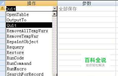 打开了quit命令的参数设置窗口,我们点击右边的下拉箭头打开下拉列表,在这个列表中看到有三个选项,提示:指的是在推出access的时候提问你是否要保存数据;全部保存:就是不提示直接保存数据;退出:就是直接退出不保存数据。