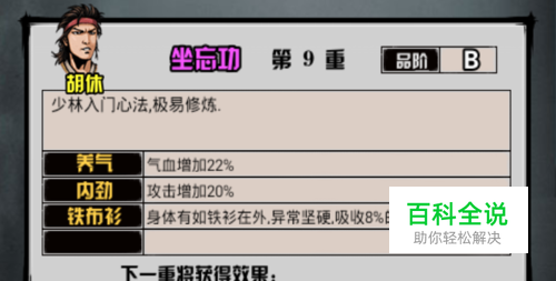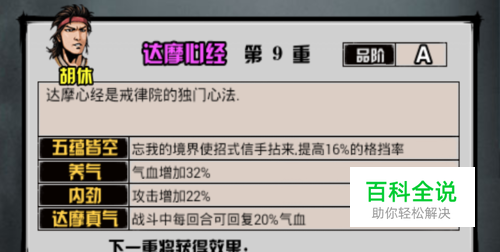 【九阳神功】: 佛法达到250以后(300点必定发现)在藏经阁读楞伽经时有几率发现经文中的九阳神功,这个时候使用文房四宝就可以获得手抄版九阳神功。 学习九阳神功后每三层(3、6、8)需要请教觉远禅师,解读到299点就不能继续解读了,第300点的契机是需要吃8~15个炎阳丹(建议吃之前存档)。