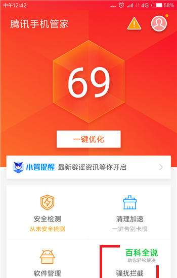 点击打开手机管家后,在里面找到【骚扰拦截】功能并点击打开该功能。