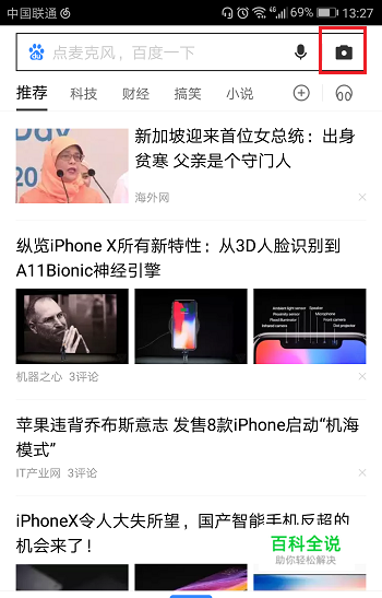 第二步进去之后,选择搜索框右边的拍照图标,如下图所示: