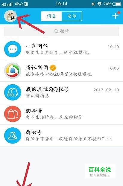 打开qq 首先,确保手机下载了qq软件,然后打开qq,点击最下方左边“消息”那一栏,如下图箭头所指。在“消息”的页面中,找到左上方自己的头像,如下图箭头所指,点击头像进入下一步。