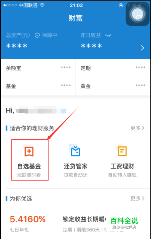 在财富页面的理财服务中,找到【自选基金】,点击进入。