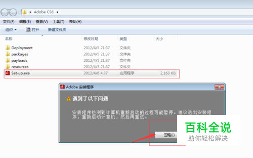 打开第二个photoshop CS6出现下图的文件点击最后一个红色表示的文件set-up.exe这时弹出对话框忽略。