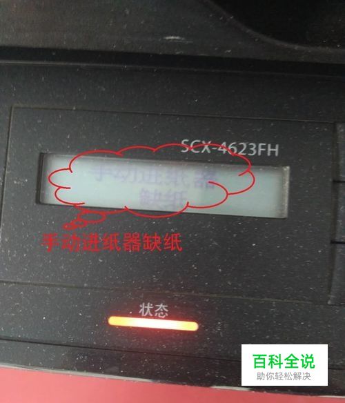 突然提示手动进纸器缺纸,一般是打印机设置的问题,或者是打印机传感器的问题,我们一个一个排除,scx-4623fh正常待机时,显示屏下面的灯是不亮的,打印灯亮起红灯说明打印机有故障了,我们先关闭打印机并关闭电脑,全部重新启动试一下故障能不能排除。