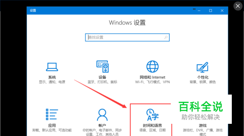 用快捷键组合方式“Win+I”,即同时按住电脑的WIN和I键,调出Win10的设置窗口,然后单击其中“时间和语言”,如图所示。