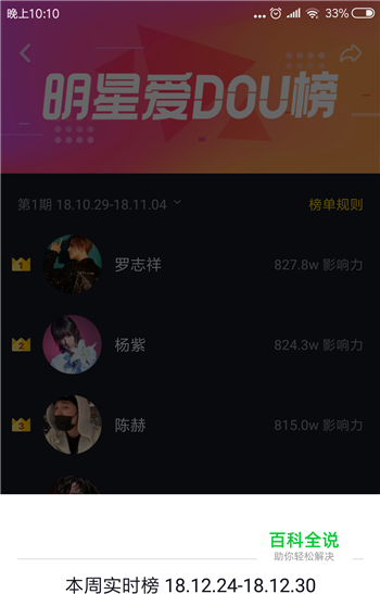 选择好后就能看到第几期的明星爱DOU榜的排行情况了,每周的明星影响力都是不同的。