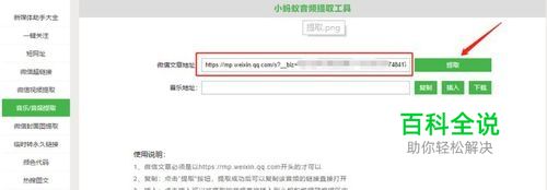 文章中音频和所有音乐文件可同时提取,可以点击右侧的复制、插入、下载进行操作。 复制按钮:点击复制可以复制音频链接,链接可以通过浏览器打开。 插入按钮:点击插入可以将提取的音频直接插入到小蚂蚁编辑器的编辑区中。 下载按钮:点击下载可以将音频内容下载到本地电脑。下载到本地之后可以直接上传到微信公众平台。