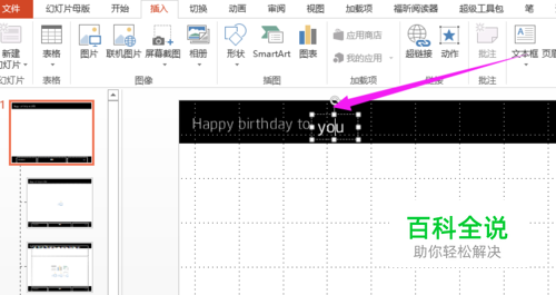 插入2个文本框,分别输入Happy birthday to(18点)和you(20点),两个文本框错落放置。进入绘图工具,选择金色的艺术字样式。 退出母板视图,勾掉网格线。