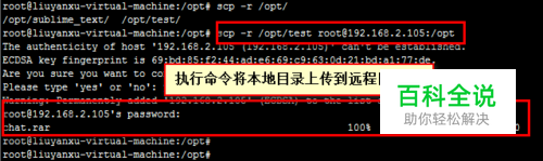 首先我们启动两台ubuntu系统的设备,并且确保两台设备都开启了ssh远程登录,且两台设备能互相通信。 然后我们介绍第一条命令将本地的目录上传的远程服务器目录上。执行命令"scp -r /opt/test root@192.168.2.105:/opt"。本条命令意思为将本地的目录/opt/test上传到远程192.168.2.105的opt目录下。然后根据提示输入root的密码,等待即可上传完毕。