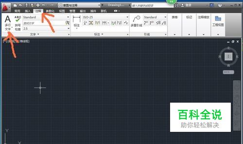 打开一个CAD文档,我们来讲解文字的输入方法,打开“注释”菜单,选择“文字”项。