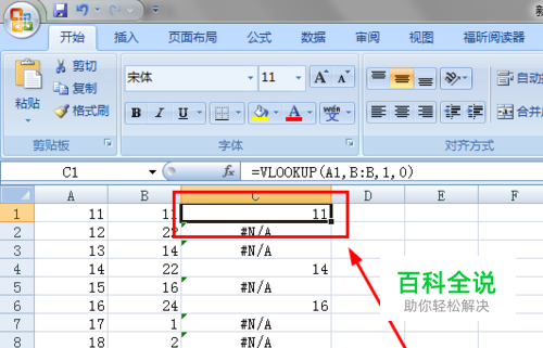 另一个例子:我现在要找出A列中包含B列的数,然后显示在C列。函数式为:==VLOOKUP(B1,A:A,1,0) 意思就是说用B1在A列一个一个地排查,如果A列里有B1,A1就会出现在C列里,如果没有就会在C列显示#N/A(就是空值)。