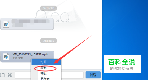 在电脑上可以看到同一窗口,发送好以后,右击视频文件,单击复制,把它粘贴到桌面上。